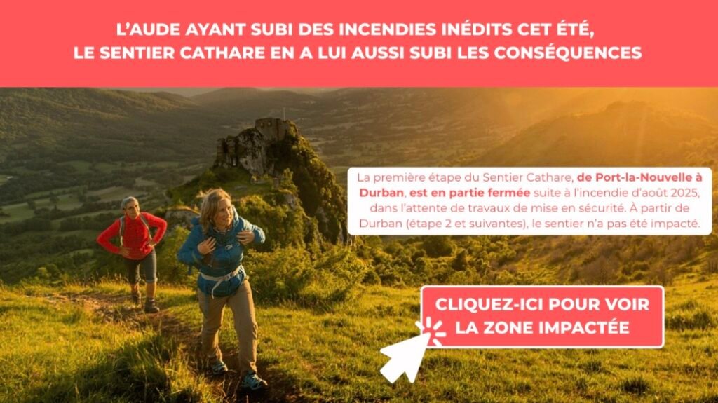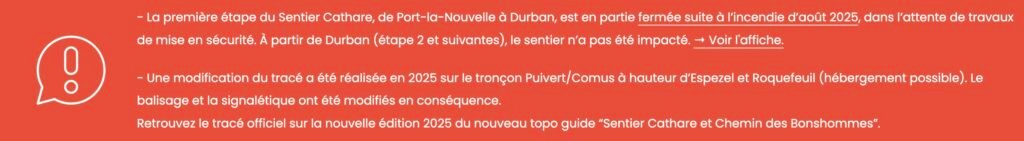 • Nous conseillons aux randonneurs de commencer l’itinéraire à Durban-Corbières, car l’étape précédente a été fortement touchée par les incendies.